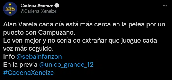Según la información que brindó el periodista Sebastián Infanzon de Cadena xeneize , Sebastián Battaglia ha aumentado la consideración futbolística sobre Alan Varela. No sería raro pensar que en los próximos partidos oficiales el volante juvenil del club le gane el puesto al colombiano. Ante esta información , en las redes sociales los hinchas desbordaron de felicidad.