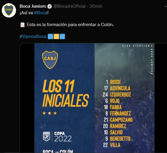 ¿Cómo será la formación de Boca? Luego de especular durante toda la semana se terminó confirmando el equipo que paró en los últimos cuatro entrenamientos. Es decir que Boca saldrá al campo de juego con Agustín Rossi, Luis Advíncula, Carlos Izquierdoz, Marcos Rojo, Frank Fabra; Pol Fernández, Jorman Campuzano, Juan Ramírez; Eduardo Salvio, Darío Benedetto y Sebastián Villa.