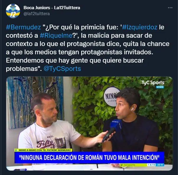 Referente como jugador y ahora como integrante del Consejo de Fútbol, Jorge “Patrón” Bermúdez se mostró fastidioso y expresó: “¿Por qué la primicia fue: ‘Izquierdoz le contestó a Riquelme’. La malicia para sacar de contexto lo que el protagonista dice, quita la chance a que los medios tengan invitados. Entendemos que hay gente que quiere buscar problemas”.