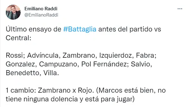 Si bien Battaglia todavía no lo confirmó y recién lo va a hacer oficial mañana a la tarde, el primer once que dispuso y sería el titular frente al Canalla, estuvo conformado por: Agustín Rossi; Luis Advíncula, Carlos Izquierdoz, Carlos Zambrano y Frank Fabra; Pol Fernández, Jorman Campuzano y Diego González; Eduardo Salvio, Darío Benedetto y Sebastián Villa.