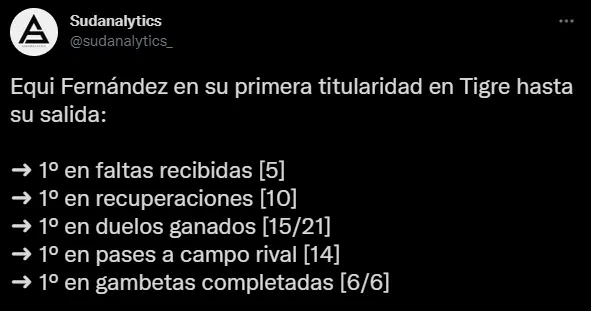 Según la información que brindó la cuenta sudanalytics Ezequiel Fernández se empezó a destacar en muchos roles. De hecho según las estadísticas del encuentro el volante lideró en varios rubros: fue el futbolista que más pelotas recupero, el que más pases a campo rival realizó. Por último fue el jugador con más infracciones recibidas.