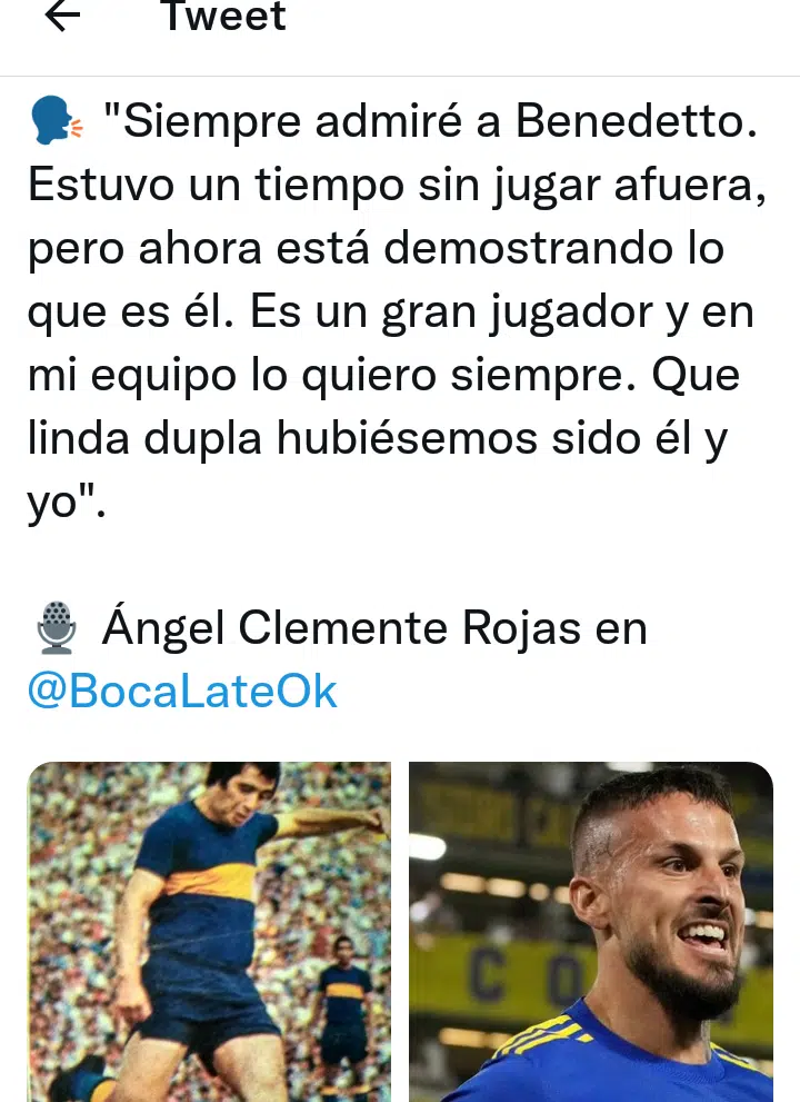 “Es un gran jugador, que linda dupla hubiésemos sido él y yo”, “rojitas” confesó sus ganas de haber coincidido con Darío Benedetto en Boca. Ambos pertenecen a distintas épocas, pero cada uno marcó la historia “xeneize” con su paso por el club. Palabras autorizadas para uno de los jugadores mas respetados y admirados por todos los hinchas.
