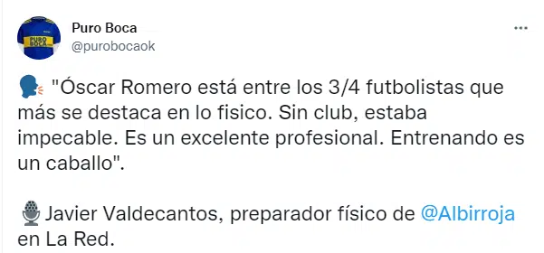 La llegada de Óscar Romero fue un salto de jerarquía para Boca, el jugador llegó hace una semana y desde que se sumó a las prácticas junto al grupo que comanda Sebastián Battaglia en el Centro de Entrenamiento en Ezeiza, sorprendió a todos por su buen estado físico a pesar de no jugar en un club hace seis meses. Es por eso que recibió los elogios.