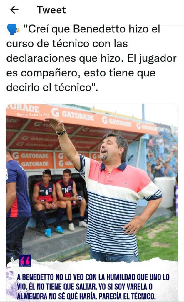 Creí que Benedetto hizo el curso de técnico con las declaraciones que hizo”, en redes sociales, muchos usuarios, entendieron que esa indirecta fue para Sebastián Battaglia. El entrenador de Boca no dio muchos detalles y no habló de manera tan detallada como si lo hizo el delantero. El DT prefirió solo decir que tanto Almendra como Varela tuvieron actos de indisciplina y por eso fueron apartados.