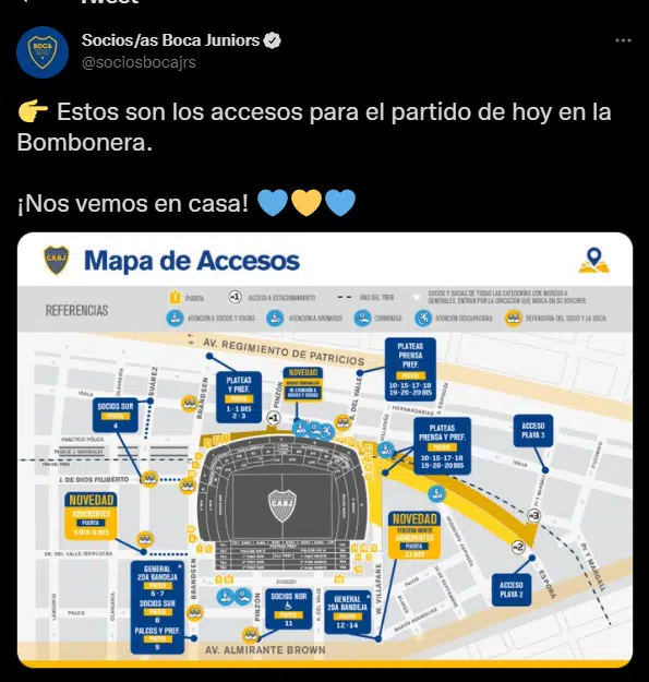 Según la información que se comunicó mediante las redes sociales, Boca definió que habrá algunas modificaciones para el ingreso de los socios adherentes. Esa categoría deberá ingresar por dos vías alternativas: la primera está ubicada en la intersección de la calle Suárez y Del Valle Iberlucea. Por esa zona se accederá a la tercer bandeja sur.