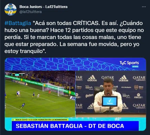 Después de la derrota 0-1 de local, frente al Globo, Sebastián Battaglia se expresó, memorioso, ante los medios: “Acá son todas críticas. Es así. ¿Cuándo hubo una buena? Hace 12 partidos que este equipo no perdía. Si te marcan todas las cosas malas, uno tiene que estar preparado. La semana fue movida, pero yo estoy tranquilo”.