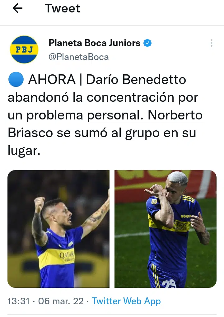La noticia que sacudió al mundo Boca, Darío Benedetto se tuvo que retirar de la concentración y no será parte del encuentro ante Huracán esta tarde en La Bombonera. Se conoció que el motivo por el cual abandono el hotel el delantero, es un problema personal. El nueve de Sebastián Battaglia es la baja sensible para recibir al “globo”.