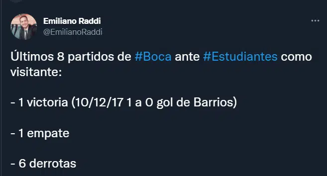 Según marca la estadística, de los últimos 8 partidos en los que Boca se enfrentó a Estudiantes en condición de visitante, el Xeneize solo logró una victoria. Además del resto de las disputas, seis fueron derrotas y una terminó en empate. El choque que finalizó en favor de los de Brandsen 805 fue el 10 de diciembre de 2017 con un gol agónico de Wilmar Barrios.