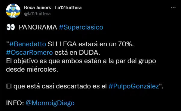 ¿Quién será el futbolista que no podrá decir presente? Diego González. El volante se sigue recuperando de un desgarro sufrido hace algunas semanas. Todavía sigue trabajando de manera diferenciada, por lo que su presencia en el partido ante River es prácticamente imposible. Por una cuestión lógica también Carlos Izquierdoz está afuera del partido.