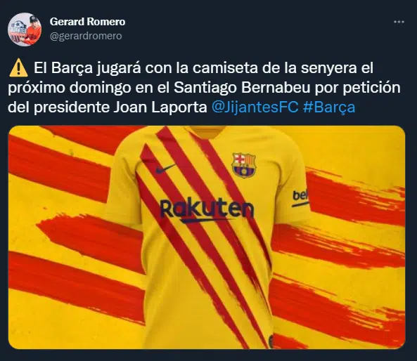 Amarilla será la indumentaria que usará Boca en el Monumental y del mismo color la que el Barcelona se pondrá para visitar al Merengue. Aparentemente, el presidente del Barsa, Joan Laporta habría pedido que en Madrid, los futbolistas Culés utilicen la camiseta “senyera”. La misma fue creada en homenaje a la bandera catalana y su historia.