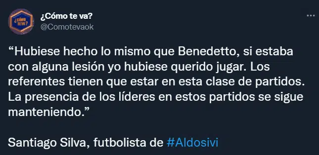 Santiago Silva charlo en el programa ¿Cómo te va?, de Radio Colonia y se refirió a la exigencia física que hizo el Darío Benedetto para poder jugar en Núñez. “Hubiese hecho lo mismo, si estaba con alguna lesión yo hubiese querido jugar”, sostuvo el uruguayo, quien también remarcó la importancia que tiene la presencia de los referentes para esta clase de partidos.