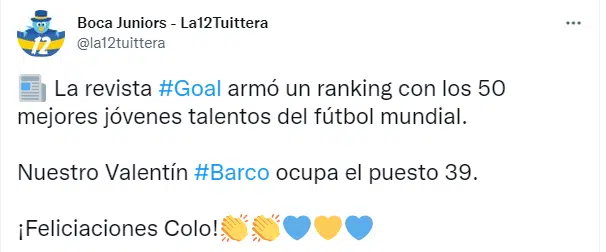 “Cuando se habla de las grandes estrellas del fútbol argentino, pocos imaginarían a un lateral izquierdo pelirrojo; sin embargo, Valentín Barco está listo para cambiar esa percepción. Solo tres jugadores han debutado en Boca a una edad más corta que el lateral de 17 años”, fueron las palabras que utilizo la revista para describir a la joya del Xeneize, que se encuentra en el puesto 39.