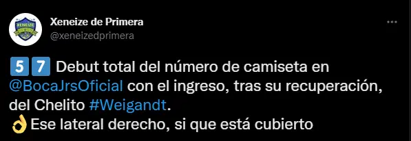 ¿Cuál es la relación de Weigandt con el número de la camiseta? Llamativamente esta noche cuando Boca salga al terreno de juego, el lateral derecho xeneize lucirá la número 57 en su espalda. Esto marcará un hecho histórico en Boca por una cuestión particular. Será el primer jugador en la historia del club que estará utilizando esa camiseta.