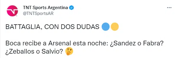 Esta noche, Boca recibe a Arsenal en La Bombonera, por la octava fecha de la Copa de la Liga Profesional. Sebastián Battaglia todavía no confirmó el equipo. Por otra parte, recordemos que el martes el Xeneize debuta por Copa Libertadores y el entrenador tiene dos dudas en la alineación: ¿Ponerlos hoy de titular o guardarlos para la competencia internacional?.