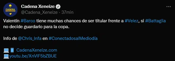 Valentín Barco por otro lado será tenido en cuenta para el equipo de reserva de Boca que mañana jugará ante Vélez. En la práctica que hizo Hugo Ibarra esta mañana, el lateral juvenil formó parte del equipo. De hecho, figura en la nómina de los futbolistas convocados para el partido de la tercera división en el encuentro del día de mañana.