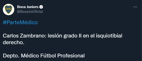 Según compartió Boca desde su cuenta oficial de Twitter, el departamento médico de fútbol profesional informó que Carlos Zambrano tiene una lesión grado 2 en el isquiotibial derecho. Esto fue como consecuencia del encuentro frente al conjunto dirigido por Rafael Dudamel, en el que el peruano salió a los 43 minutos del primer tiempo tras un choque con Luis Advíncula.