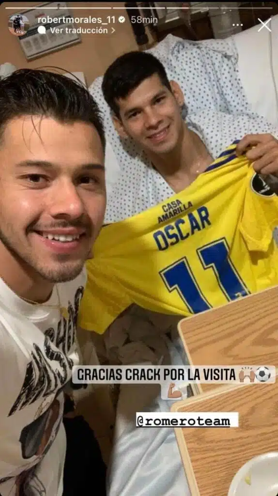 Luego de sufrir una rotura en el ligamento cruzado anterior en su rodilla derecha, el delantero de Paraguay, Robert Morales, fue intervenido quirúrgicamente en Buenos Aires por el médico de Boca, Jorge Batista. Ante esta situación, Óscar Romero se acercó a saludar a su compatriota y le regaló la camiseta alternativa amarilla del Xeneize.