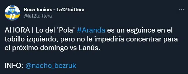 Según afirmó el periodista Ignacio Bezruk lo de Gabriel Aranda es un esguince en el tobillo izquierdo, pero esto no le impediría concentrar para el partido del próximo domingo en la Bombonera frente a Lanús. Por otra parte, también se confirmó que Rossi sufrió un desgarró. La figura del ultimo superclásico estará fuera de las canchas al menos 21 días.