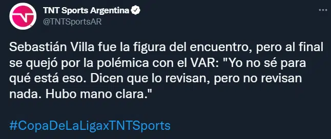 El atacante habló por todo el plantel de la Ribera y mostró su disconformidad con el VAR y el arbitraje de Facundo Tello. “Yo no sé para qué está eso. Dicen que lo revisan, pero no revisan nada. Hubo mano clara”, expresó Villa rememorando la jugada en la que Fran Fabra intentó tirar un centro, pero el brazo de Ángel González lo impidió.