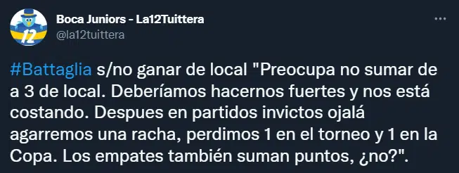 El DT de la Ribera se sentó frente a los periodistas presentes en la Bombonera y compartió su opinión sobre la campaña que viene realizando Boca. “Preocupa no sumar de a 3 de local. Deberíamos hacernos fuertes y nos está costando. Perdimos uno en el torneo y uno en la Copa. Los empates también suman puntos, ¿no?”, expresó Battaglia con una sonrisa.