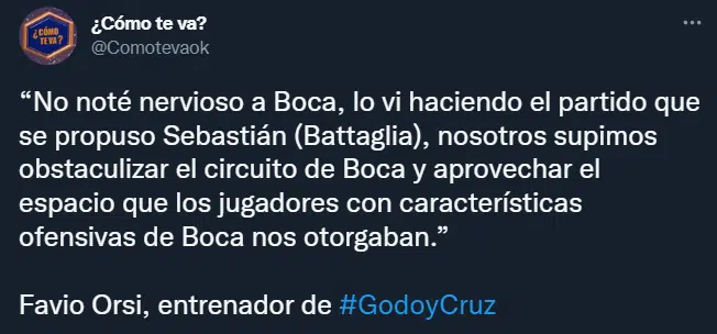Uno de los integrantes de la dupla técnica que dirige al conjunto mendocino fue entrevistado en el programa ¿Cómo te va?, de Radio Colonia y fue tajante con su comentario sobre los futbolistas de la Ribera. “Los vi haciendo el partido que se propuso Sebastián, nosotros supimos obstaculizar el circuito y aprovechar el espacio que los jugadores con características ofensivas de Boca nos otorgaban”, expresó Orsi.