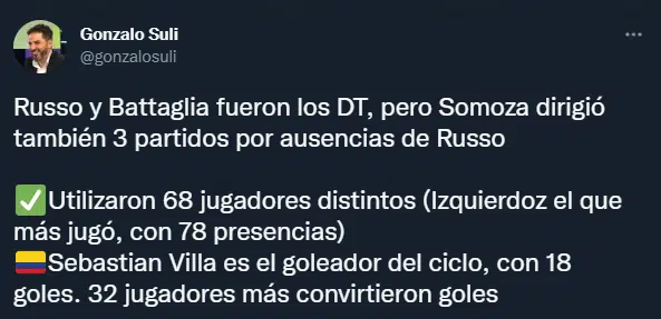 Con 18 goles vistiendo la camiseta azul y oro, Sebastián Villa es el máximo artillero durante el mandato del vicepresidente. Recordemos que el colombiano, actualmente una de las figuras del plantel, era candidato a abandonar el equipo en el último mercado de pases, sin embargo, la dirigencia fue exigente en sus peticiones y ahora ante los números queda claro el porqué.