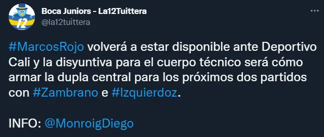 Considerando que Rojo ya cumplió con la sanción de la Confederación sudamericana de fútbol y podrá estar disponible ante Deportivo Cali, Sebastián Battaglia aún no está seguro de cuál será la dupla central para los próximos dos partidos. Recordemos que frente a Always Ready, la zaga defensiva fue compartida por Zambrano e Izquierdoz.