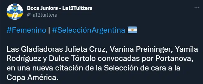 El entrenador de la Selección Argentina Femenina de Fútbol, Germán Portanova, confirmó la prelista de convocadas de cara a la próxima Copa América, que se disputará en Colombia desde el 8 de julio. En la nómina se destaca el nombre de cuatro jugadoras de Boca. Una gran noticia, que generó orgullo entre los hinchas Xeneizes.