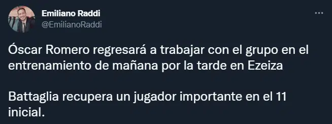 Según el periodista de Espn, Emilia Raddi, Óscar Romero regresará a trabajar con el grupo mañana por la tarde. El enganche se sumará al entrenamiento del lunes en Ezeiza junto al resto del plantel que regresará de Santiago del Estero. El paraguayo estaba en Asia con su selección disputando una serie de amistosos por la fecha FIFA.
