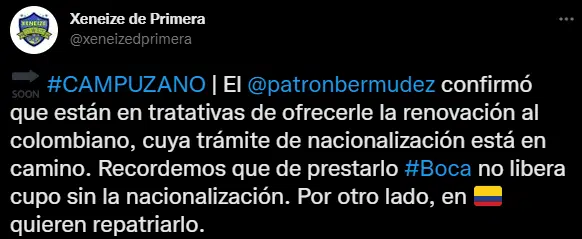 La buena noticia de la institución xeneize radica en que cuando Jorman Campuzano sea argentino, el club esta en condiciones de avanzar con alguna de las contrataciones que pretende de un futbolista extranjero. Sin embargo, esta situación todavía no se ha definido. Además Boca pretende un nuevo contrato para el volante colombiano en estas horas.