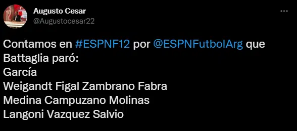 En la práctica que se desarrolló en Ezeiza, el entrenador de Boca formó con los siguientes nombres. Javier García, Marcelo Weigandt, Nicolás Figal, Carlos Zambrano, Frank Fabra; Cristian Medina, Jorman Campuzano, Aaron Molinas; Eduardo Salvio, Luis Vázquez y Luca Langoni. Estos serán los que disputen el encuentro del próximo viernes.