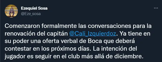 El club de la Ribera inició conversaciones con el Cali para renovarle. El central, que tiene vínculo en Brandsen 805 hasta el 31 diciembre del 2022, pretende seguir ligado a la intuición y ya recibió una oferta verbal, a la que deberá contestar en los próximos días. Todo parece indicar que el acuerdo entre las partes será rápido y habrá capitán para rato.