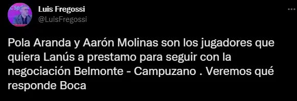 Según la información que contó el periodista Luis Fregossi, para que el acuerdo se termine cerrando, Lanús hizo una exigencia bastante alta. Además de Campuzano también pretende a Aaron Molinas y Gabriel Aranda. Aunque todavía no ha llegado la respuesta de Boca por este tema. Está claro que esta decisión seguramente no será del agrado de todos en la institución.