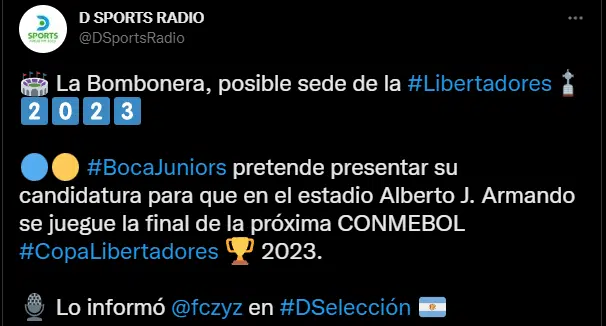 ¿De que se trata? Según la información que se brindo en D Sports Radio (103.1), La Bombonera será planteada como escenario para una posible final de copa Libertadores durante el año 2023. Ante esto hubo una reacción muy importante de los hinchas de Boca en relación a esta situación. Pero la decisión final la tomarán las autoridades de CONMEBOL.