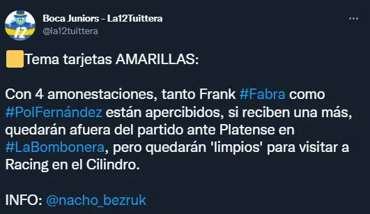 Frank Fabra y Guillermo Pol Fernández tienen cuatro tarjetas amarillas acumuladas en lo que va del torneo local. Si reciben una más, quedarán afuera del partido ante Platense en La Bombonera, pero estarán libres para visitar a Racing en el Cilindro de Avellaneda. Cabe destacar que ambos futbolistas se perfilan como titulares para el encuentro contra el Patrón.