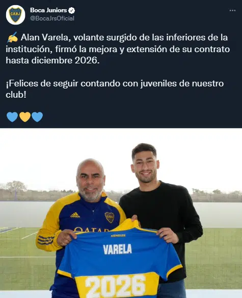 Boca hizo oficial el acuerdo en sus redes sociales. “Alan Varela, volante surgido de las inferiores de la institución, firmó la mejora y extensión de su contrato hasta diciembre 2026″, expresó un posteo publicado en la cuenta del Xeneize con una foto del futbolista y Mauricio Serna. En la misma, el Chicho y el futbolista sostienen una camiseta con la nueva fecha estampada.