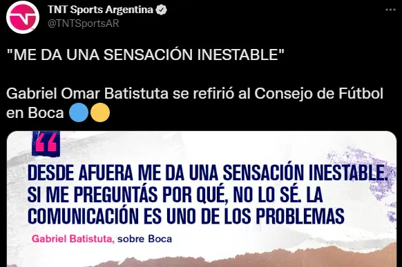 ¿De quién se trata? Nada más ni nada menos que de Gabriel Batistuta. El ex goleador de la institución opinó sobre los diversas acciones que tuvo Juan Román Riquelme: “Desde afuera me da una sensación inestable. Si me preguntas por que, no lo sé. La comunicación es uno de los problemas”. Aunque está claro cuales son las intenciones.