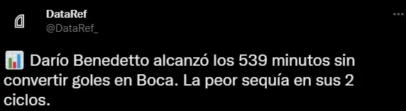 Según la información que publicó el sitio Dataref, Darío Benedetto acumula un récord negativo vistiendo la camiseta de Boca. El delantero xeneize acumula 539 minutos sin poder convertir. De hecho es su peor racha en la institución. Aunque también es cierto que es uno de los principales apuntados por los hinchas debido a sus últimos rendimientos.