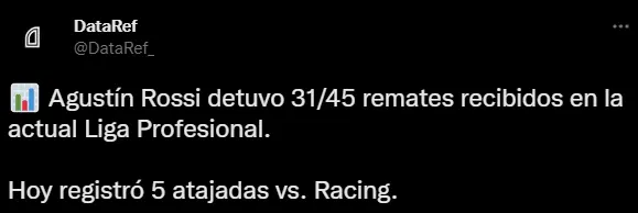 Según las diversas informaciones que publicó el sitio Dataref, Agustín Rossi tuvo 5 atajadas contra Racing para poder mantener el arco en cero. Aunque también es cierto que durante los partidos que atajó durante este torneo acumula un récord increíble. De 45 remates que recibió el arquero xeneize, 31 fueron atajados por el arquero titular.