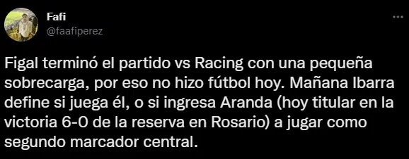 Según la información que brindó el periodista Facundo Pérez, Hugo Ibarra piensa en realizar una sola variante. De hecho por algunos problemas físicos Nicolás Figal está en duda para el encuentro de esta noche. Aunque es cierto que por ahora el entrenador del primer equipo está analizando posibles variantes para el encuentro ante el conjunto canalla. Aunque está claro que confirmará todo cuando falte poco tiempo para el inicio del partido.