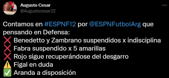 Según la información que brindó el periodista Augusto César, Hugo Ibarra nuevamente deberá rearmar la defensa. Esto se da debido a que Frank Fabra llego al límite de cinco tarjetas amarillas. Por lo que Agustín Sández podría pasar al lateral izquierdo. Sin embargo debe utilizar a Aranda como marcador central junto a Facundo Roncaglia. Aunque todavía no se ha tomado la decisión debido a que faltan un par de prácticas para confirmar esta noticia.