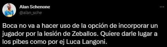 Según la información que publicó el periodista Alan Schenone, Juan Román Riquelme tiene totalmente decidido no incorporar a ningún futbolista más. El motivo de esta decisión se debe a que le quieren dar rodaje a algunos jugadores surgidos del club. Uno de esos caso es el de Luca Langoni quien ha tenido rodaje en los últimos encuentros.