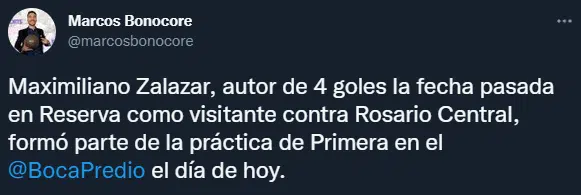 Maximiliano Zalazar, autor de 4 de los 6 goles que convirtió la Reserva del Xeneize frente a Rosario Central hace una semana, formó parte de la práctica de Primera en el Centro de entrenamientos de Ezeiza. El extremo derecho podría estar entre los convocados para el partido del domingo, en La Bombonera, frente a Atlético Tucumán.