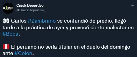 Según se conoció en las últimas horas, ayer el Kaiser se equivocó de dirección y llegó tarde al entrenamiento de Boca. En vez de ir a Casa Amarilla, el zaguero peruano encaró para el predio de Ezeiza. Aparentemente, por esta cuestión llegó tarde y se entrenó de forma diferenciada pensando en el encuentro del domingo contra Sabalero.
