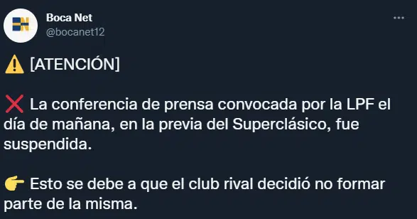 Al parecer, la conferencia de prensa, previa del Superclásico, convocada por las autoridades de La Liga Profesional para el día de mañana, fue suspendida porque River decidió no formar parte de la misma. Por el momento, desde Nuñez no habrían dado un justificativo a tal decisión. Veremos si esto representa algún tipo de multa económica al Millonario.