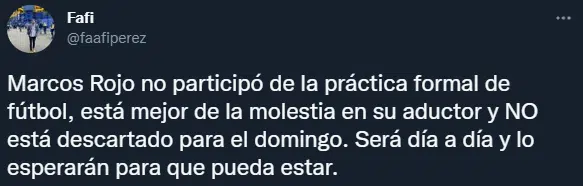 Según informó el periodista Facundo “Fafi” Pérez, Marcos Rojo no participó de la práctica formal de fútbol. Sin embargo, está mejor de la molestia en su aductor y no está descartado para el domingo. Al central, que entrenó diferenciado del resto de sus compañeros, lo esperan día a día para ver si puede estar presente ante el conjunto millonario.