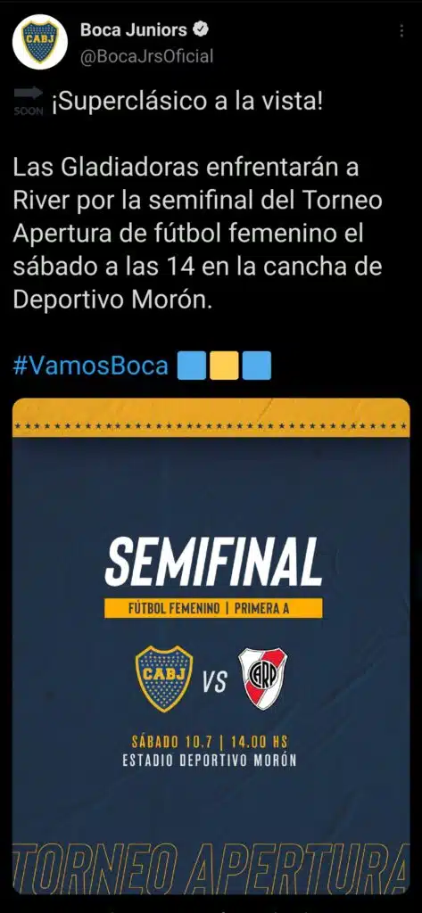 La AFA confirmó que este sábado 10 de julio se jugará la semifinal del torneo de fútbol femenino. Boca enfrentará a River Plate desde las 14 h en el Estadio Deportivo Morón. Tras vencer a Independiente por 3 a 0, las futbolistas enfrentarán a las Millonarias, a quienes no reciben desde la final del torneo pasado, donde vencieron por 7 a 0.