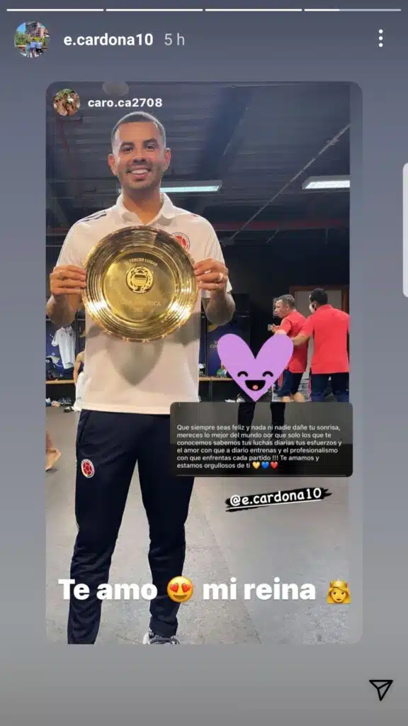 Sin embargo, lo más importante del día pasa por otro lado. Edwin Cardona (todavía no se confirmó qué pasará con su regreso) compartió una historia de Instagram publicada por su esposa, Carolina Castaño donde destacó justamente su sacrificio: “Solo los que te conocemos sabemos tus luchas diarias, tus esfuerzos y el amor con que a diario entrenás y el profesionalismo con que enfrentás cada partido”.