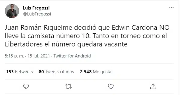 “Si pudiéramos cambiar los números en la Libertadores, la 10 la llevaría Cardona. Por el torneo creo que sí se podrá modificar”. Riquelme le había dado de palabra ese premio. Pero la situación y la decisión es otra dado que, hasta ahora, la 10 no se podrá lucir en la espalda de ningún futbolista. En el caso de Edwin, en el campeonato seguirá usando la 8 y en la Copa, la 30. Aunque todavía no se sabe si llegará a jugarla.