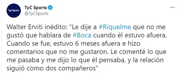 Y después reconoció las charlas que tuvo con Román: “Le dije a Riquelme que no me gustó que hablara de Boca cuando él estaba afuera. Cuando se fue, estuvo seis meses afuera e hizo comentarios que no me gustaron. Y cuando volvió a Boca, me acerqué y le dije que tenía que hablarle. Le comenté lo que me pasaba y me dijo lo que él pensaba, y la relación siguió como dos compañeros”.
